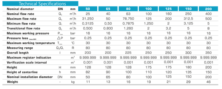 Hermetically sealed register (IP68). Display on 7 drums for m3. Magnetic protection. DN50-DN200. Register maybe rotatable through 50 °C. Optional pulse, M-bus, Radio frequency output. GG25 cast iron housing. Powder coating ensurers maximum corrosion protection. Low head loss. Water temperature up to 50°C.