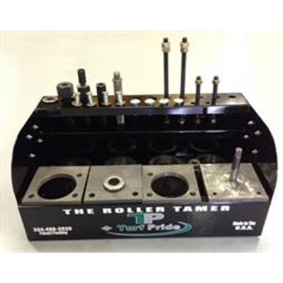 The Roller Tamer allows anyone regardless of skill level to quickly, easily, and properly rebuild cutting unit rollers without causing damage to the roller and without the headaches and frustration normally associated with this task. This patent pending device will assist with most types of rollers presently and formerly manufactured for the turf industry including water-pump bearing style rollers, tapered roller bearing type, radial ball bearing type, gang mower, basket rollers and others. Purchase a Base Unit then add the kit that best suits your needs for make and model of rollers to service.