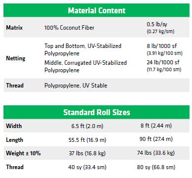 The composite turf reinforcement mat (C-TRM) shall be a machine-produced mat of 100% coconut fiber matrix incorporated into permanent three-dimensional turf reinforcement matting. The matrix shall be evenly distributed across the entire width of the matting and stitch bonded between super heavy duty UV-stabilized nettings with 0.50 x 0.50 in. (1.27 x 1.27 cm) openings, an ultra heavy duty UV-stabilized, dramatically corrugated (crimped) intermediate netting with 0.5 x 0.5 in. (1.27 x 1.27 cm) openings, and covered by a super heavy duty UV-stabilized nettings with 0.50 x 0.50 in. (1.27 x 1.27 cm) openings.