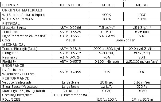 - Maximum permissible velocity and shear stress has been obtained through vegetated testing programs featuring specific soil types, vegetation classes, flow conditions, and failure criteria. These conditions may not be relevant to every project nor are they replicated by other manufacturers. Please contact Propex for further information.