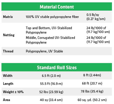 The composite turf reinforcement mat (C-TRM) shall be a machine-produced mat of 100% UV stable polypropylene fiber matrix incorporated into permanent three-dimensional turf reinforcement matting. The matrix shall be evenly distributed across the entire width of the matting and stitch bonded between a ultra heavy duty UV stabilized nettings with 0.50 x 0.50 inch (1.27 x 1.27 cm) openings, an ultra heavy UV stabilized, dramatically corrugated (crimped) intermediate netting with 0.5 x 0.5 inch (1.27 x 1.27 cm) openings, and covered by an ultra heavy duty UV stabilized nettings with 0.50 x 0.50 inch (1.27 x 1.27 cm) openings.