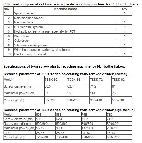 Description for Twin- screw extruder for waste plastic recycling machine for PET bottle flakes or others: