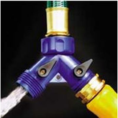 Water two places at one time with the 235 Twin Shut-Off Valve! Connect the valve to your faucet to create two male connections-- with each connection independently controlled. A quarter turn of the handle and the water flow is shut off. Molded from high quality ABS plastic. 3/4 male and female hose threads.