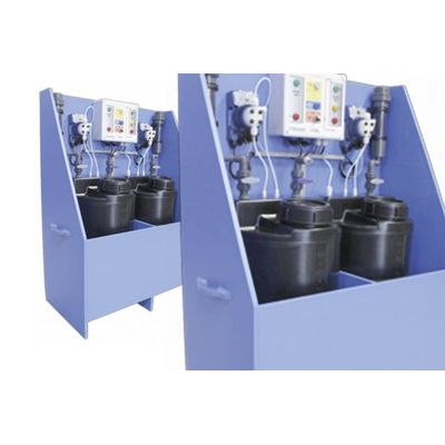 After the 3 hour mixing time, the TwinOxide 0.3% ClO2 solution is transferred to the dosing tank automatically. The transfer pump will pause when the dosing tank is full. The mixing and transfer procedure will be reset automatically when the mixing tank is empty.