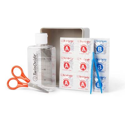 New in our product line are the TwinOxide Tabs 0.1%. Packed in a nice full colour carton, containing 6 pairs of tablets. Generating 6 x 100 ml of chlorine dioxide at 0.1%. 8 drops are enough to disinfect 1 liter of water (dosage can vary depending on water contamination).