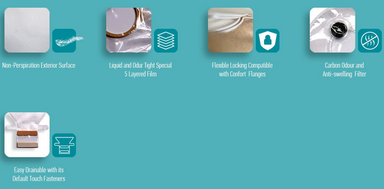 Comfortable Use with Non-Perspiration Exterior Surface. With Specially Designed 5 Layered Film, Liquid and Odur Tight. Carbon Odour Filter. Opaque and Transparent Colour Range. Compatible with Confort Flanges. Safety Locking System.Easy Trackable with the Dates and Product Code on the Bag. Easy drainable with its Default Touch Fasteners.
