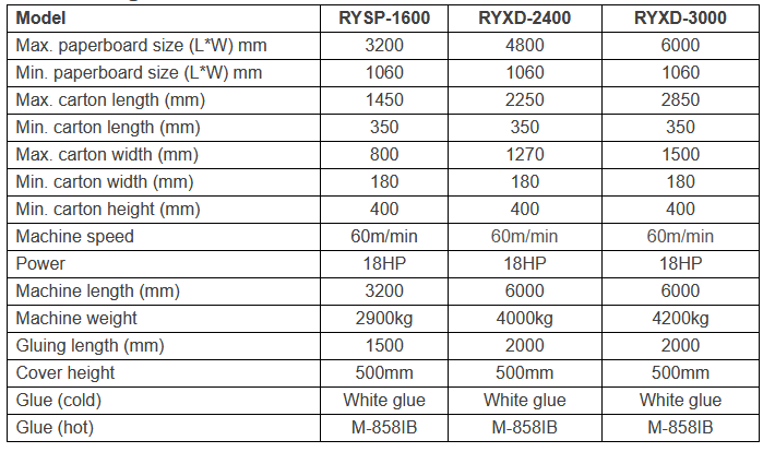 This machine is used for connection two pieces paperboard by glue to making big carton. It is suitable for E, C, B, A, AB flute corrugated paperboard. Can produce single-pieces, two pieces glued carton. This machine can work with most kinds quality paperboard, the glue gun spray system can set independently, can produce heterogenic shaped carton, flat carton and single piece box, especially for large, high strength corrugated artificial difficult production.