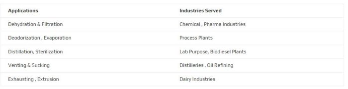 As a backup pump for Mechanical Booster in Vacuum System, Water Recirculation System, Special Type Couplings, Exhaust Silencer for specific application.