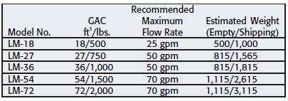 The LM Adsorber Systems can use any of the 3 sizes of the LM Adsorbers, which are designed to contain 500, 1,000 or 2,000 pounds of granular activated carbon each, selecting the proper size for either the flowrate or expected carbon usage. The LM Adsorber Systems can typically treat up to 60 gpm using two adsorbers in series, or up to 120 gpm with the adsorbers in parallel operation.