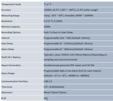 Designed to be Multi-use. Temperature & Humidity measurement and recording. Statistics available on LCD screen. No software needed to export data. Automatically generate PDF report and CSV file. Easy operation by pressing button on/off. LED light indicating for different status. Reprogrammable software for logging parameters, alarms, and start delay.