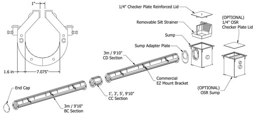 The Commercial U-drain system features a 1" slot opening. A wide variety of commercial sump pits and accessories are available, including silt strainers and oil separators.