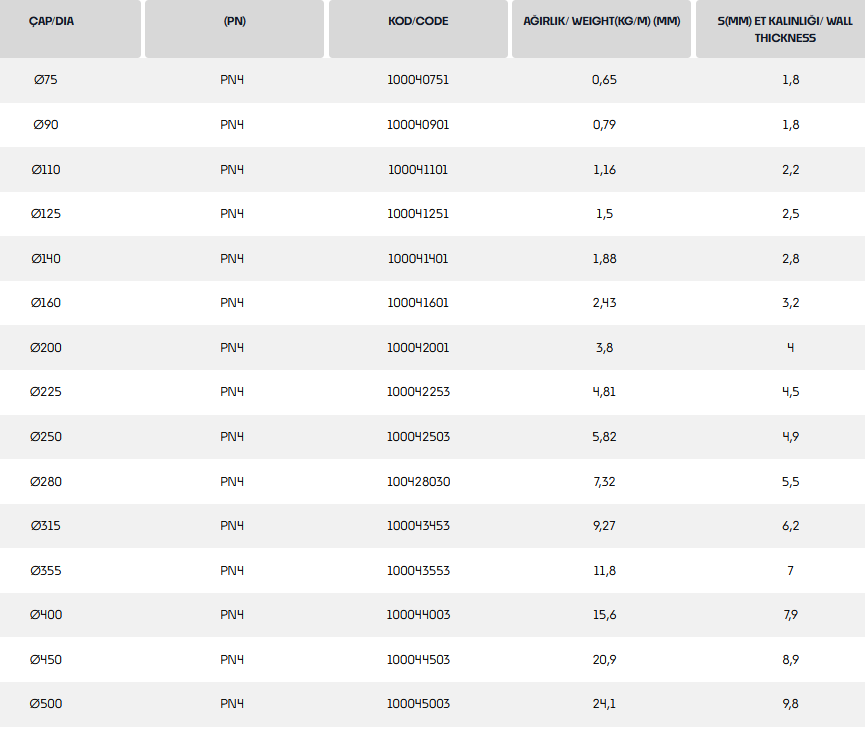 With installments starting from 3.94 TL!! Diameters: .20 to .400. Pressure Rating: PN4-PN6-PN8-PN10-PN16. Pipe Lengths : It is in 3 Meters. Operating Temperature: Valve connections: conform to international standard, such as ISO, ANSI, BS, EN 1452-2.