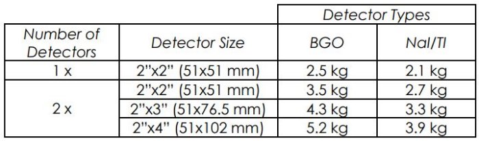 - Detector Sizes: 2”x2” (51x51 mm), 2”x3” (51x76.5 mm), or 2”x4” (51x102 mm) detector sizes available with volumes of 6.3 in3 (104 cm3), 9.4 in3 (156 cm3), or 12.6 in3 (208 cm3), respectively