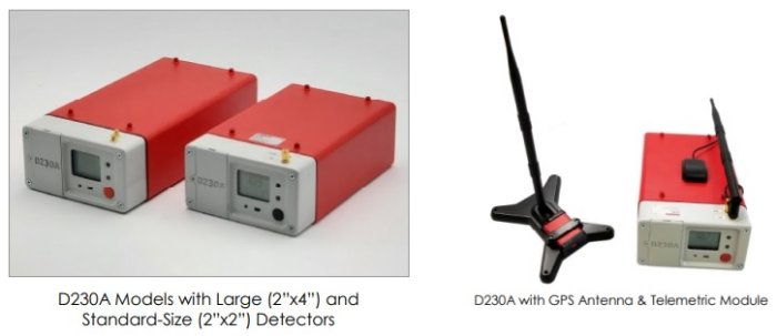 The D230A is a gamma-ray spectrometer designed specifically for UAVs. The system allows operators to simultaneously measure the dose rate, total intensity of gamma radiation, and intensity of the energy windows corresponding to potassium, uranium, thorium, plus a wide range of manmade radionuclides. The standard D230A system utilizes two fully independent 1024 channel gamma-ray spectrometers, each with its own detector, and a lightweight data acquisition and control unit. Spectra of both detectors are accumulated and saved separately, with a sampling rate of one second. Both detectors contribute an integrated spectrum during monitoring activities, including dose rate.