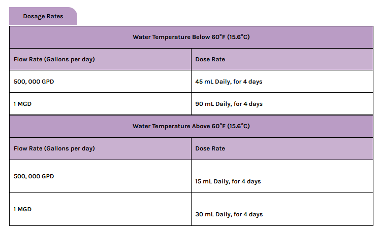 Nitrifier Pro is added daily in the aeration basin and dosed according to plant flow rate and water temperature. Once applied, the wastewater treatment bacteria continue to reproduce on their own, requiring no ongoing applications. Operators can further enhance performance by maintaining a pH of 7–8, DO above 2 mg/L, stable BOD removal, and adequate alkalinity levels.