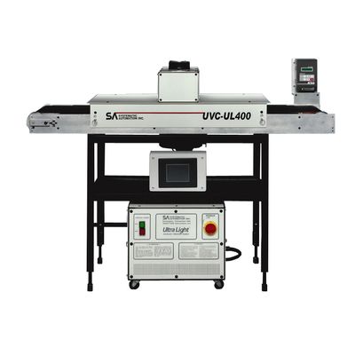 The Ultra Light UV Conveyor by Systematic Automation is a high-efficiency curing system designed for advanced UV curing of coatings, adhesives, and inks. This system is equipped with the Ultra Light UV System, boasting adjustable power levels up to 400 watts per inch, accommodating a range of curing needs. The conveyor features rapid in-house customization with a production lead time of just 2-3 days, enabling precise tailoring to specific requirements. Its adjustable height feature ranges from 1 to 3.25 inches, with options for larger shrouds, which makes it versatile for various product sizes. The durable Teflon-coated belt, with underlying rollers, enhances the conveyor's ability to handle heavier items. The modular irradiator allows a focus adjustment, ensuring precise curing, while the integrated blower prevents overheating of sensitive components. The Ultra Light UV Conveyor integrates LED technology that optimizes energy efficiency while maintaining compatibility with conventional UV systems.