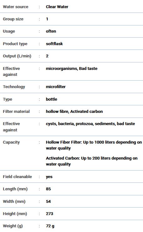 Ultra-slim and fast water filtration system for potable water on the go. Filters microorganisms, improves taste and reduces odors. Fits into any pouch or pocket.