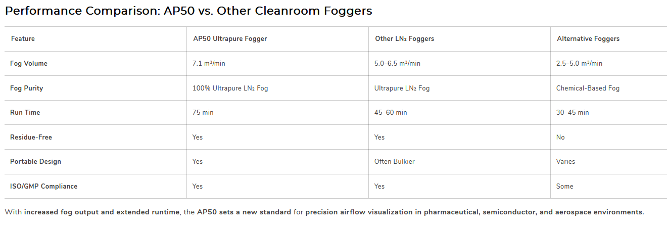 The AP50 Ultrapure Cleanroom Fogger is a powerful liquid nitrogen (LN2) fogging system, engineered for cleanroom validation, airflow visualization, and contamination control. As part of the next generation of ultrapure fogging solutions, the AP50 provides greater fog volume, extended runtime, and increased efficiency over previous models, making it an ideal replacement for traditional cleanroom foggers. By utilizing LN2 and deionized water, the AP50 generates ultra-dense, residue-free fog, ensuring clear, contaminant-free airflow tracking in ISO 3–7 cleanrooms. Whether conducting GMP audits, HEPA filter testing, or airflow turbulence analysis, the AP50 delivers exceptional visibility and performance.