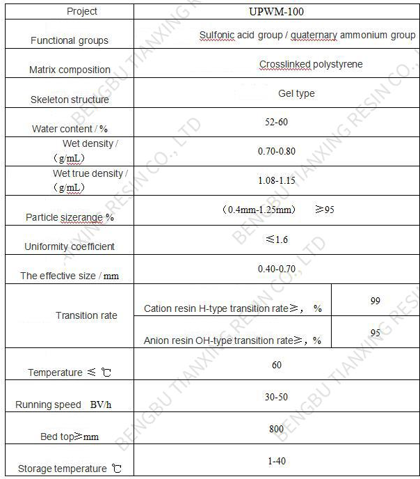 UPWM-100-type ultra-pure water special polishing mixed bed resin system adopts international advanced nuclear grade resin manufacturing process, the use of high purity reagents through many strict procedure is strictly a refining derived ultrapure mixed bed resin (polished resin). Suitable for terminal refined mixed bed in the pre-treatment equipment, RO, EDI ultrapure water system as the preparation of ultra-pure water.