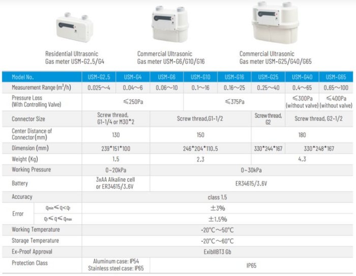 USM Series Ultrasonic Gas Flow Meter G2.5-G65 is the smart meter that adopts TOF (Time of Speed) principle to measure flow velocity of gas medium, with built-in temperature & pressure (≥G6) compensation and smart software algorithm, consumed gas volume can be calculated and displayed on meter’s screen. Optional GPRS or NB-IoT wireless communication allows reading gas volume and arranging top-up remotely. Gas leakage check system realized by built-in shut-off valve can guarantees user safety by automatically cutting off gas supply in case of inconspicuous leakage. USM series are widely applied for natural gas metering in residential, commercial and industrial fields.