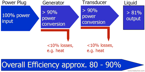 Due to its outstanding transformation efficiency, the transducer does not require forced cooling, such as cooling water or compressed air. It is built into a closed housing and there are no louvers in the transducer case. Lower heat losses means, that more energy is transmitted into the liquid, resulting in a better sonication. The overall energy efficiency of the UIP1500hd is approx. 80-90% from the power plug into the liquid.