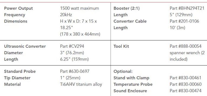 The VCX 1500 is a reliable and durable choice for many applications. This model includes a 1" diameter, 10" long probe with a 100μm maximum amplitude and a booster. A variety of probe options are available including the flow cell inline processing accessory. Electrical requirements are 220V, 50/60Hz, single phase, 20A. Part No. VCX 1500A can be used to order the system without the standard probe and booster. Air cooling of the converter by compressed air is required to prevent overheating of the ultrasonic processor.