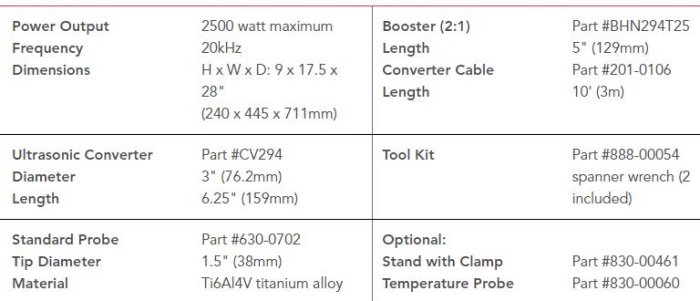 The VCX 2500 is a reliable and durable choice for many applications. This model includes a 1.5" diameter, 15" long probe with a 100μm maximum amplitude and a booster. Additional probe or flow cell accessory options are available upon request. Electrical requirements are 220V, 50/60Hz, single phase, 30A. Air cooling of the converter by compressed air is required to prevent overheating of the ultrasonic processor.