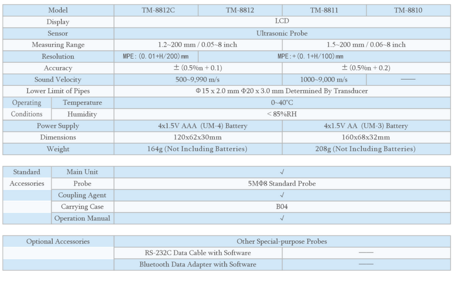 Wide Measuring Range and high resolution. With high power emission and broad band receiving sensitivity, the gauge can match probes of different frequencies. That makes it easy to measure the rough surface, even cast iron. It is widely used in almost all kinds of industries. Applicable to measure the thickness of many materials, e. g. Steel, Cast iron, Aluminum, Red copper, Brass, Zinc, Quartz glass, Polyethylene, PVC, Gray cast iron, Nodular cast iron. Used the exclusive Micro-computer LSI circuit and crystal time base to offer high accuracy measurement & fast measuring time. Automatic power off to conserve power.