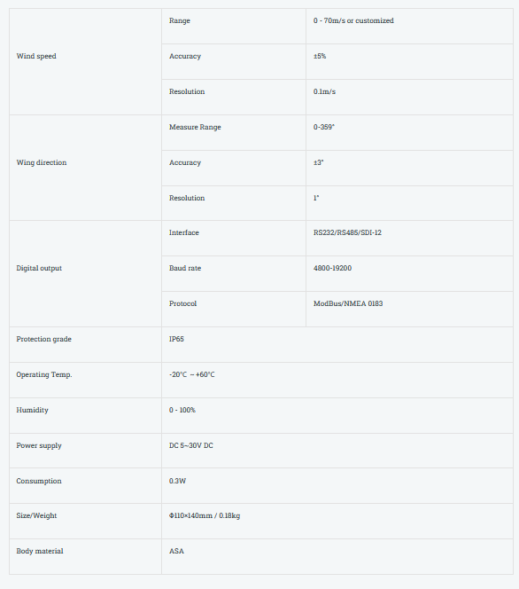 ES-W3056 Wind Speed And Direction Transmitter is a kind of instrument which can measure the wind speed, wind direction and acoustic temperature by using the time difference of ultrasonic propagation in the air. Compact space structure makes the volume smaller and the appearance more beautiful; all aluminum alloy shell makes the weight lighter; integral heating can work normally in cold and frozen weather. It is recommended for wind power, tunnels, high-altitude buildings and other fields.