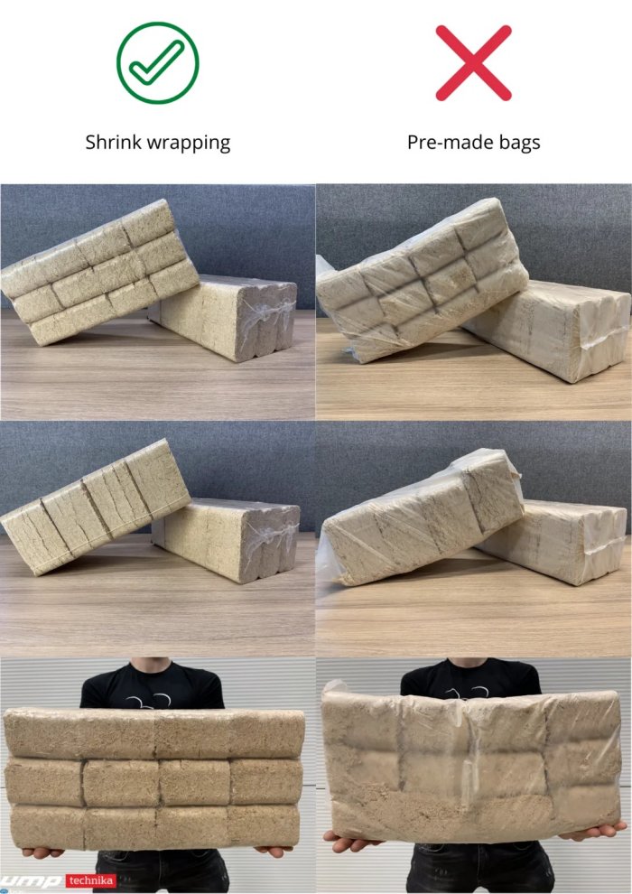 In contrast, currently widely used pre-made briquette bags have the disadvantage of unnecessary movement of briquettes inside the package which in turn disintegrate during logistics and lose value in the eyes of the end-consumer. Using shrink wrapping tightens the pack making it easier and safer to handle, increases resistance to humidity and even allows briquettes to be stored out in the elements. Stick-on carry handles are optional to provide the ultimate briquette pack.