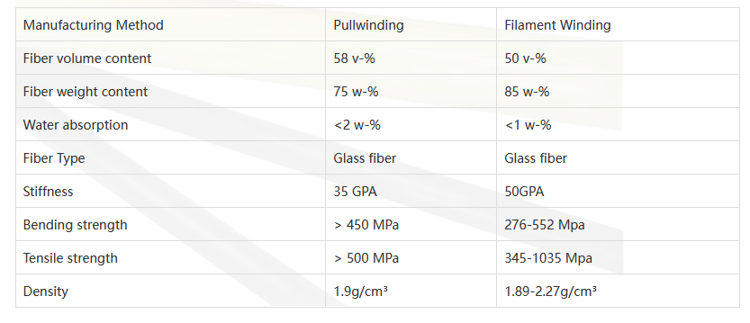 The pullwinding technology is similar to pultrusion, but pullwinding profiles have much better strength and stiffness than pultruded profiles, especially in the transversal direction because there is roving at both longitudinal and transversal direction, so they are suitable to be used as loading structural profiles. The cost of pullwinding products is 20~30% more expensive than pultruded profiles because of more complicated process. Pullwinding poles can be widely used in electrical poles, light poles and transportation high pressure pipes.