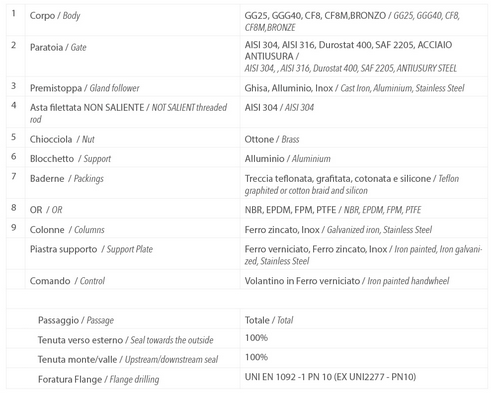 Body:GG25, GGG40, CF8, CF8M,BRONZE. Gate: AISI 304, , AISI 316, Durostat 400, SAF 2205, ANTIUSURY STEEL. Gland follower: Cast Iron, Aluminium, Stainless Steel.