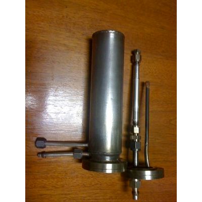 Uniform Temperature Membrane Test Rig used to test hydrogen permeation in disc or tube (specify) membranes at pressures up to 300 psi and temperatures up to 450 C. Stainless Steel, 1.75" OD with an interior volume 1.4" ID" by 8" or 18" long, sealed by a copper or graphite gasket. A counter flow annulus provides improved temperature uniformity. Membranes attach by swagelock and graphite ferrules, sold separately. Fits our high temperature furnace. See description and flows.