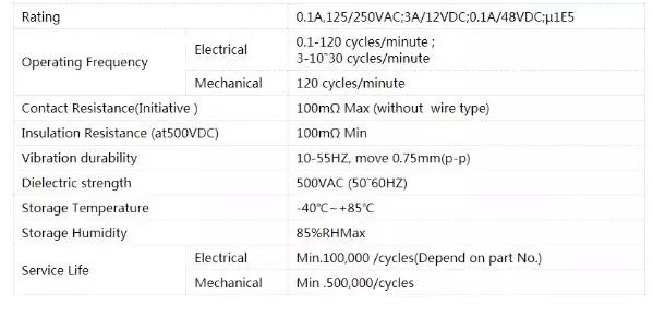 - Rating : 0.1A ,125/250VAC; 3A/ 12VDC ;0.1A/ 48VDC, u 1E5.