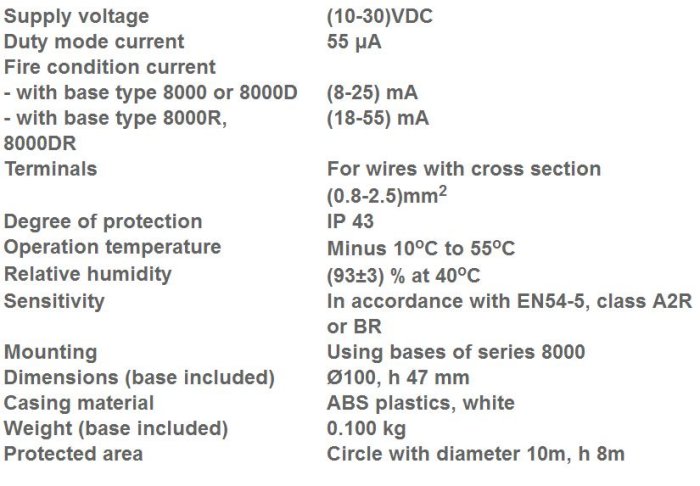The fire detector provides reliable early warning of a Fire condition upon reaching a rate of rise of the temperature or fixed temperature threshold in the protected premises. It is available in two versions (A2R or BR) depending on the temperature threshold in accordance with the European Standard EN54-5. The fire detector is suitable for premises with normal ambient temperature, without possible sudden changes.