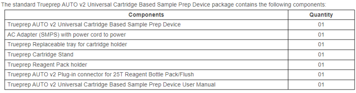 Fully automatic sample prep device works in tandem with Trueprep AUTO cartridge and Trueprep AUTO v2 Reagent Kits for extraction and purification of nucleic acids from clinical specimen.
