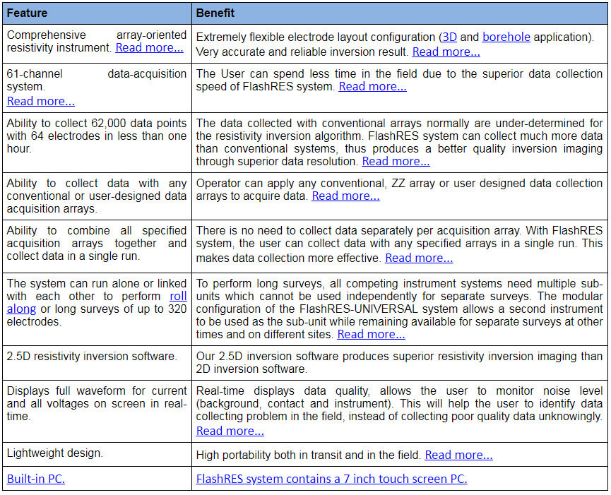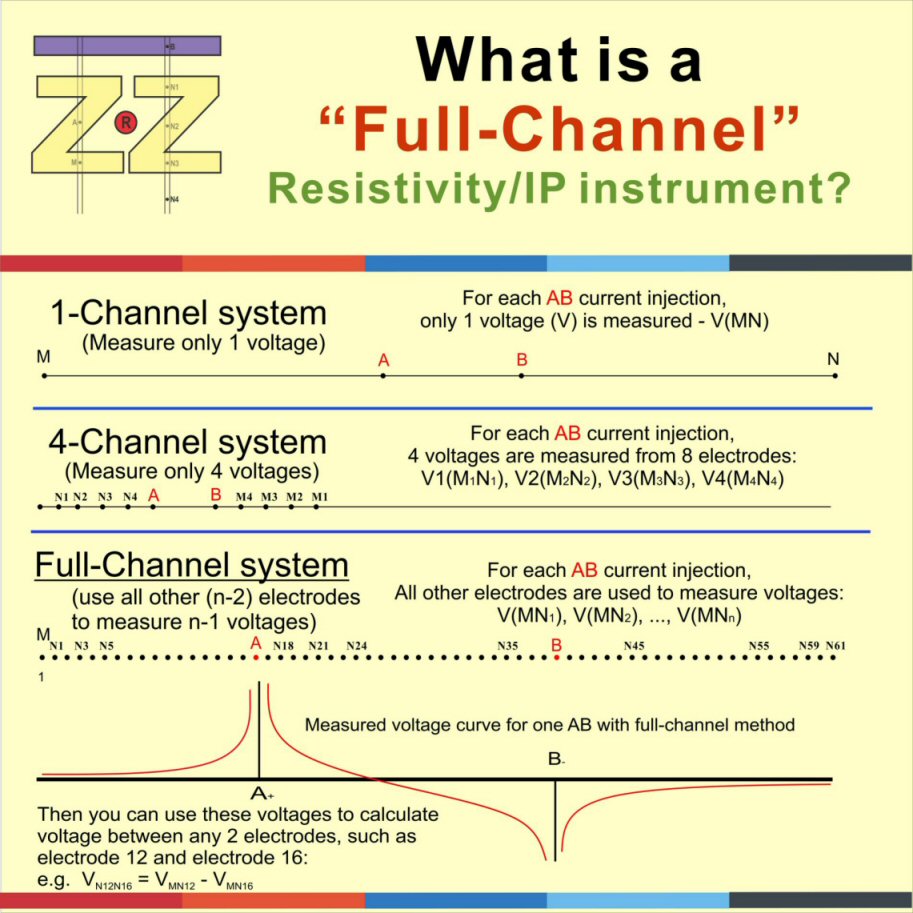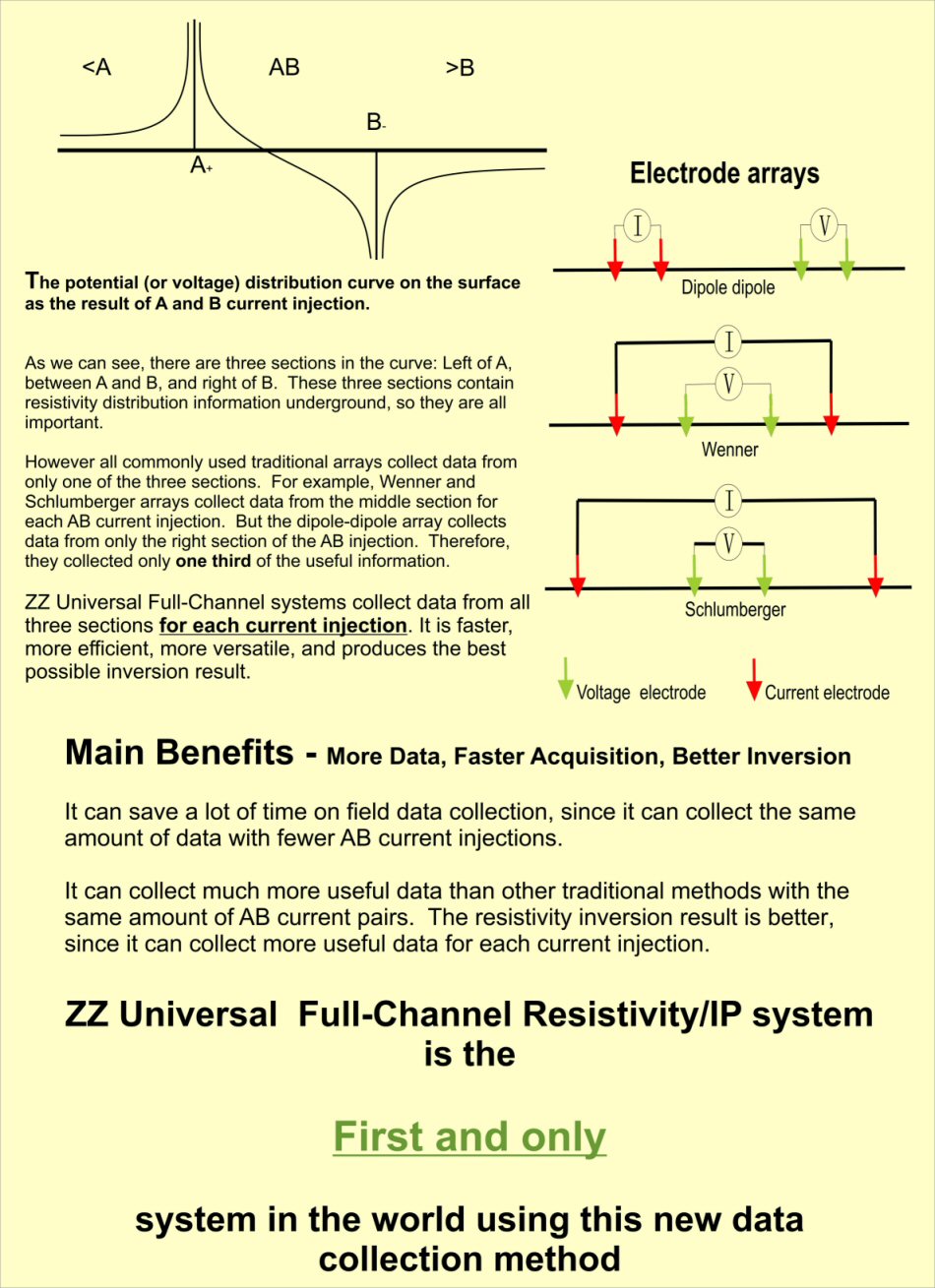 General - Measurment variables: Resistivity, IP and SP. Operating time: 30 data points/second. Measurement range: From -10V to +10V. SP compensation: Automatic cancellation. Resistivity cycle times: From 0.1S to 10S. Automatic multi-electrodes: Yes. Data samping rate: 100KHZ. Data storage: Unlimited. Data transmission: USB. Power supply: External 12V battery. Operating temperature: -20 to +70 oC. Operating Humidity: 98% RH. Weight: 5.3 kg. Dimension: 339 x 295 x 152 mm. Built-in GPS: Optional.