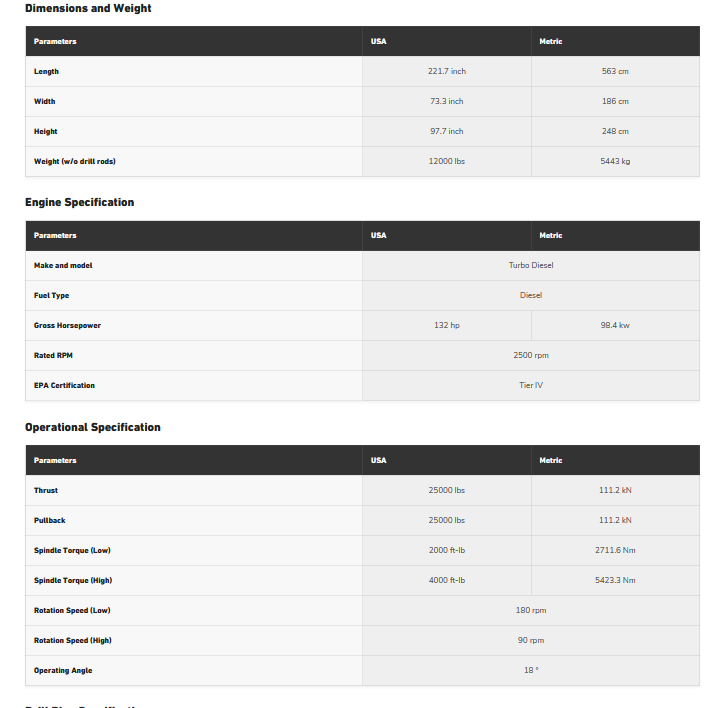 Push/Pull: 25000 lbs. Torque: 4000 ft-lb. Engine: 132 hp. Mud Pump: 72.9 gpm.