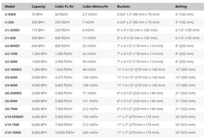 U Series bucket elevators utilize a single trunk casing and are built with thicker steel to handle corrosive, abrasive and hostile materials. When the elevator experiences extreme temperatures and/or additional harsh material characteristics, Universal Industries, Inc.® offers chain instead of belt for various U Series Elevators. Each U Series model offers an EASY DUMP® capacity rating that utilizes gravity discharge techniques to reduce product damage. Each of our elevators can reach a range of different capacities and speeds, while offering similar accessories and options for each one. Available in powder coated carbon, stainless, or galvanized steel with buckets available in HDPE, carbon steel, nylon and urethane. (EASY DUMP® speed, the speed suggested for gentle handling, is only guaranteed on the lowest capacity for each elevator).