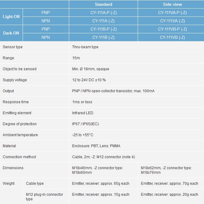 CY-100 series sensors are available as thru-beam, retroreflective (with and without polarization filters) and diffuse reflective types. Standard (axial) and side-view (radial) types are available, providing you with flexibility when mounting the sensors. Moreover, all sensors can be ordered as a cable type or with an M12 plug-in connector.