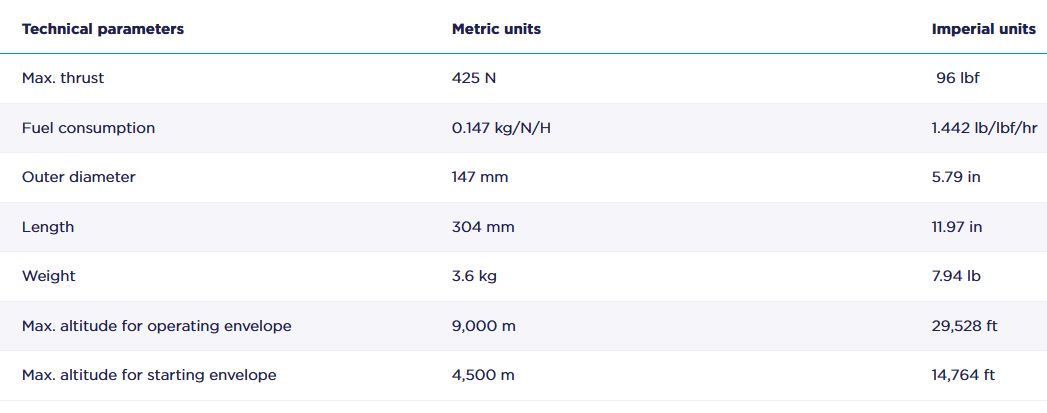 Its distinctive features include simple and compact design, low weight and plug & play solution (all components including ECU integrated in the engine body). The engine weighs only 3.6 kg and provides a maximum thrust of 425 N. The start-up sequence is advantageously short at less than 25 seconds and there is an easy and rapid kerosene starting system. The PBS TJ40-G1 can restart from the ground as well as in-flight and has unilimited starting position angles.