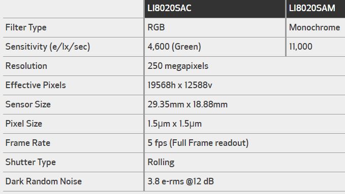 The Canon LI8020SA CMOS sensor minimizes noise without sacrificing speed by sharing floating diffusion capacitance between multiple pixels, resulting in shrunken readout circuitry and larger photodiode sizes. Progressive reading of small 1.5µm pixels occurs across 16 digital output channels to handle the enormous amount of image data created by roughly 250 million effective pixels. At full resolution, the LI8020SA CMOS sensor achieves a fast frame rate of 5 FPS. With single Region of Interest (ROI) windowing, faster frame rates can be achieved through reduced resolution, creating flexibility in performance.