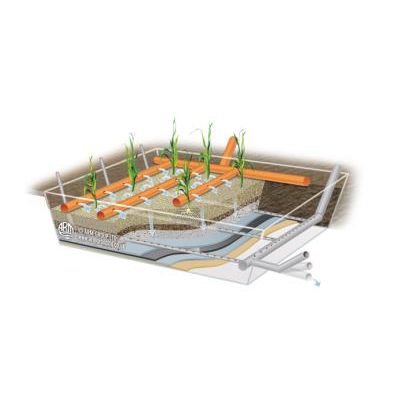 Unsaturated vertical flow (VF) systems are essentially the same as the horizontal flow systems in that they comprise a lined excavation. Unlike the horizontal flow reed bed the vertical flow is not constantly flooded but free draining. The effluent is applied in a batch process across the surface of the bed until the surface is flooded. The effluent gradually drains down through the bed with air replacing the wastewater in the bed as it drains. The next dose traps the air which leads to a highly aerated system with good oxygen transfer permitting increased microbial growth and activity. Unsatruated VF systems are more effective than HF systems at ammonia removal due to increased oxygen levels within them and can cope with stronger effluents.