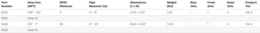 The Gator and Mini Gator nozzles cut and remove roots, grease, blockages, and scale in various pipes ranging from 2" – 20". Encased in a compact stainless-steel body the strong reinforced internal design rotates the head. 3D fluid mechanics in the head smoothly direct all the incoming high-pressure water to the four rotating jets in the rear of the head and one in front. These rotating jets create an extremely powerful 360 degree all around complete cleaning of the pipe, flushing, and removing debris in less passes. The offset front jet eliminates blockages easily and effectively. A case kit is available which includes an additional skid.