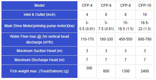 The centrifugal fish pump is designed for catching and transferring live fish.It features a unique impeller design that minimizes damage to the fish during operation.This pump is commonly used for transferring fingerlings, catching grow-out fish,and in other similar applications.It is suitable for use with rainbow trout,Atlantic salmon,black croaker,sea bream,bass,yellow croaker,and tilapia,as well as various types of shrimp.