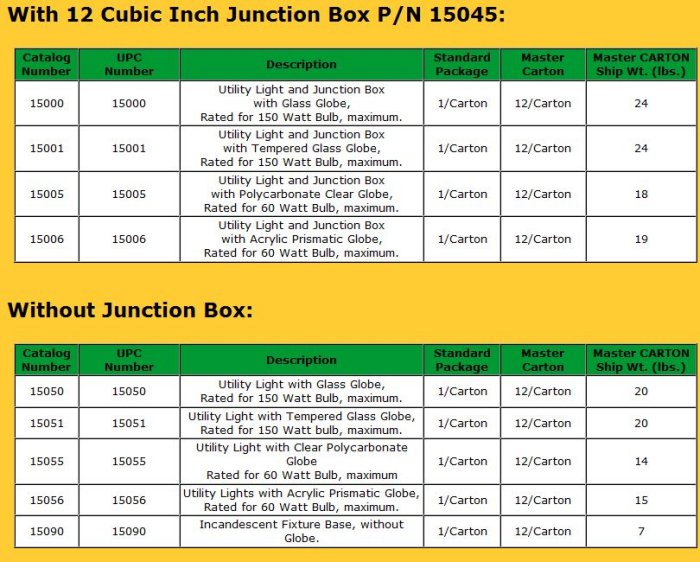 High impact, corrosion resistant incandescent fixtures are UL Listed for use in wet or damp locations. Non-metallic, phenolic junction boxes retain their shape under severe enviornmental conditions such as heat, cold, ammonia, and humidity. All globes are UV resistant to protect against discoloration. Globe options: Glass, Tempered Glass, Acrylic Prismatic, and Clear Polycarbonate. The tough construction of Utility Light globes withstands severe impact and cleaning by high powered pressure washers. Resilient water resistant gaskets provide a tight, long lasting seal that will not dry out or disintegrate. Strong, stainless steel hardware resists corrosions.
