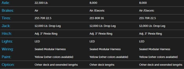 Capacity: 14,000 Lb, 16,000 Lb, 30,000 Lb. Extension: Manual, Manual, Manual With Roller. Overall Width: 96”/102”, 96”/102”, 96”/102”. Length: 22’ – 32’, 21’ – 31,’ 27’ – 42’. Main Frame: Tube, Tube, Tube.