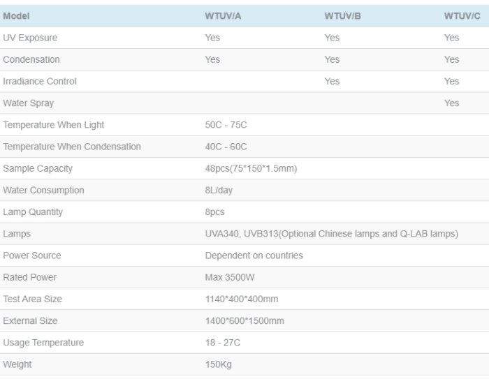 - WTUV/B: UV Exposure + Condensation + Irradiance Control