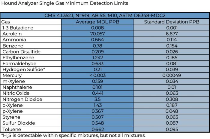 The Cerex Hound Series has as low as parts-per-billion minimum detection limits and wide dynamic ranges, allowing earlier and more thorough detection of gases than traditional sensor arrays. In comparison to outdated technologies, Hound series analyzers feature multi-gas monitoring of individual species, lower detection limits, no water vapor interference, inherent calibration and no sensors to poison.
