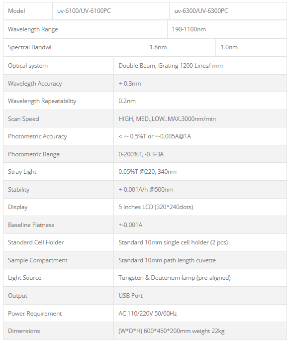 UV-6100 / 6300PC is an advanced double beam design, with fixed bandwidth, the two detectors measure sample and reference respectively and simultaneously for optimizing measurement accuracy. They provide excellent performance for measurements in the range of 190 to 1100nm, the memory is 32K. They are suitable for pharmaceutical, biochemical and clinical lab applications as well as routine applications such as quantitative analysis, kinetics, wavelength scan, multiple components and DNA/Protein, PC Windows application software make these instruments versatile. Both instruments provide excellent performance for measurements.